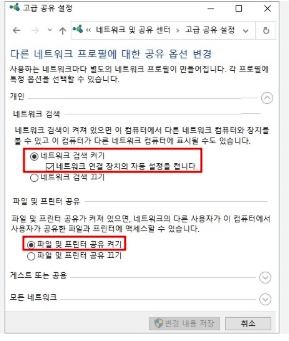 - 파일 및 프린터 공유 켜기